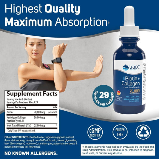 High-Potency Trace Minerals Ionic Biotin & Collagen Supplement for Healthy Hair, Skin, and Joints - Strawberry Mango, 2 fl oz