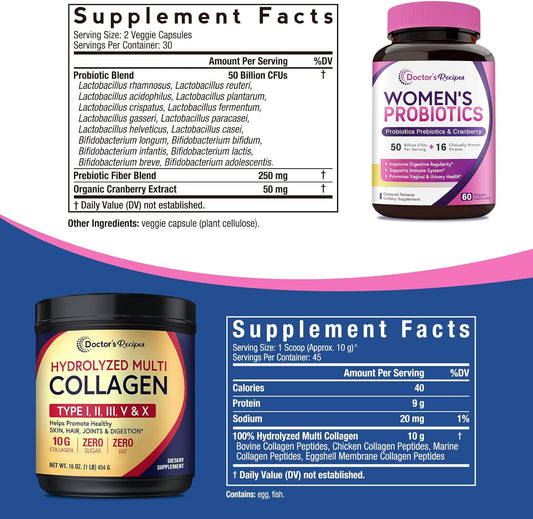 Women’s Probiotics & Collagen Bundle for Vaginal, Skin, Hair, Nail Health - Doctor's Recipes Value Pack, Gluten-Free (60 Capsules + 45 Servings)