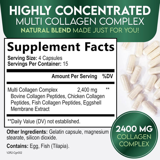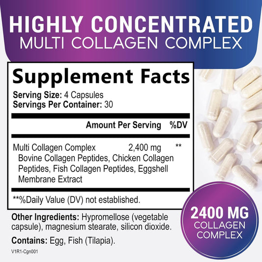 1800mg Multi Collagen Protein Peptides Capsules - Types I, II, III, V, X - Joint Support, Hair, Skin, Nails - 100% Natural - 180ct