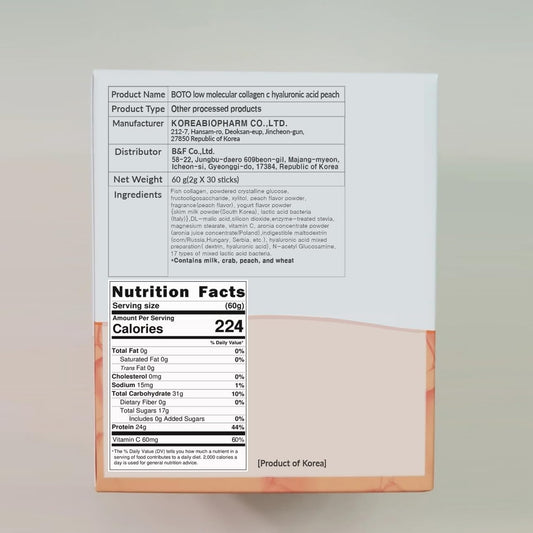 Korean Beauty Peach Flavored Collagen Peptides Powder Supplement with Hyaluronic Acid and Vitamin C - 30 Day Supply