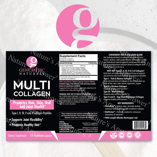 120 Veg Caps Genceutic Naturals Multi Collagen Capsules for Healthy Hair, Skin & Nails - Types I, II, III, V & X - 1500mg Non-GMO, Pasture-Raised, Cage-Free, Cruelty-Free