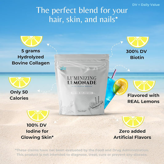 Bali Beach Luminizing Lemonade Beauty Drink Powder with Collagen, Biotin, Blue Spirulina - Promotes Healthy Hair, Skin, and Nails
