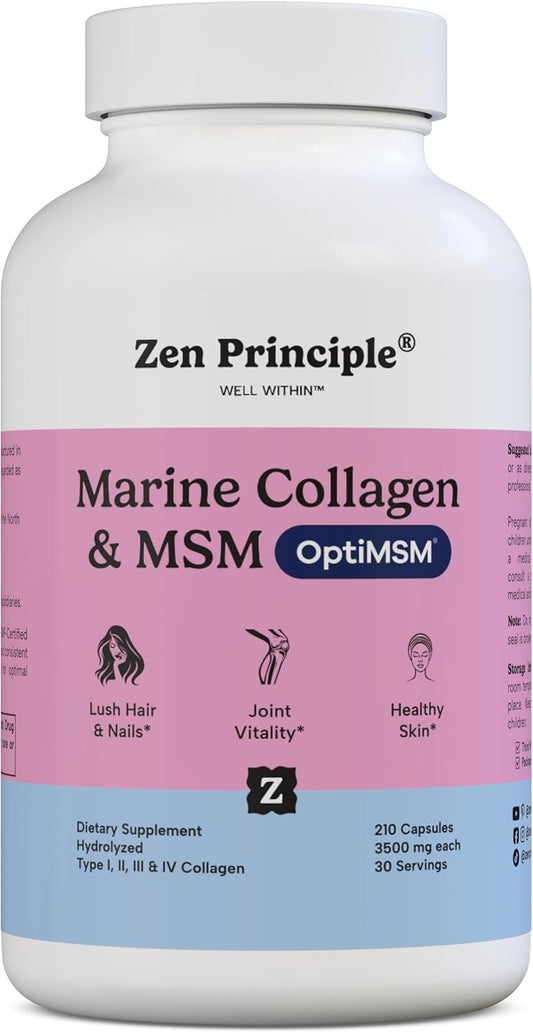Zen Principle Marine Collagen Peptides Powder with OptiMSM® - Skin Support Supplement. Wild-Caught Fish, Non-GMO. 420 Capsules.