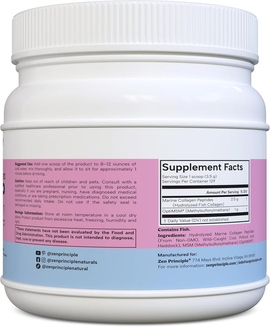 Zen Principle Marine Collagen Peptides Powder with OptiMSM® - Skin Support Supplement (16 oz)
