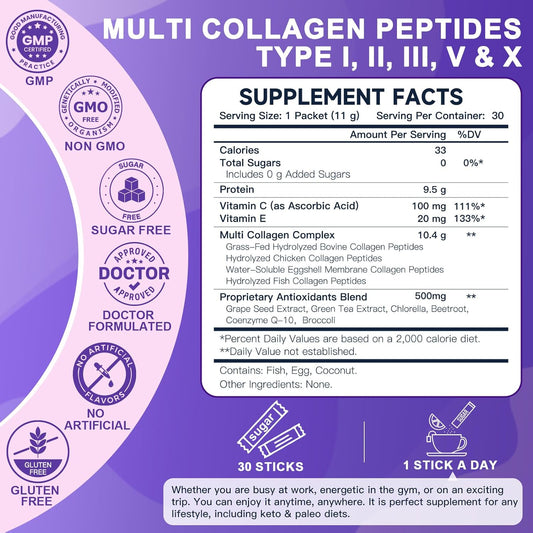 Women's Collagen Peptides Powder Packets - Type I II III V X Collagen with Antioxidant Blend, Vitamins C & E for Skin, Hair, Nails, Joints - Non-GMO - 30 Sticks