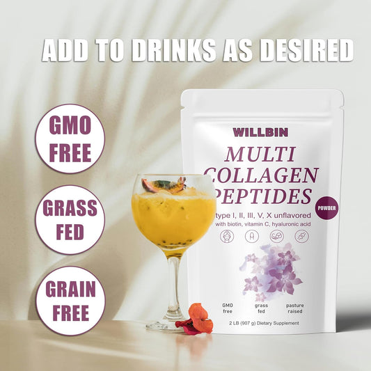 2lb Willbin Multi Collagen Peptides Powder - Type I, II, III, V, X with Biotin - Unflavored - 80 Servings - Non GMO Hydrolyzed Powder for Men & Women