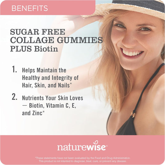 Sugar-Free Hydrolyzed Collagen Gummies for Women with Type I & III Peptides, Biotin, Vitamin C, E, Zinc - Hair, Skin, Nails & Joint Support - 180 Count - 3-Month Supply by NatureWise