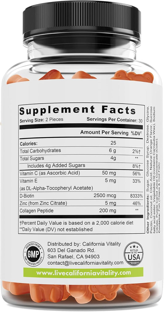 California Vitality Collagen Gummy 200mg+ with Vitamin C, E, Biotin, and Zinc - Overall Support - Gluten-Free, Non-GMO, Dairy-Free - 60 Gummies - Made in USA - 1 Month Supply