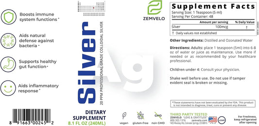 Silversalu Colloidal Silver Liquid Mineral Supplement - Immune Support - 1.9ml Serving Size, Approx. 57 Drops