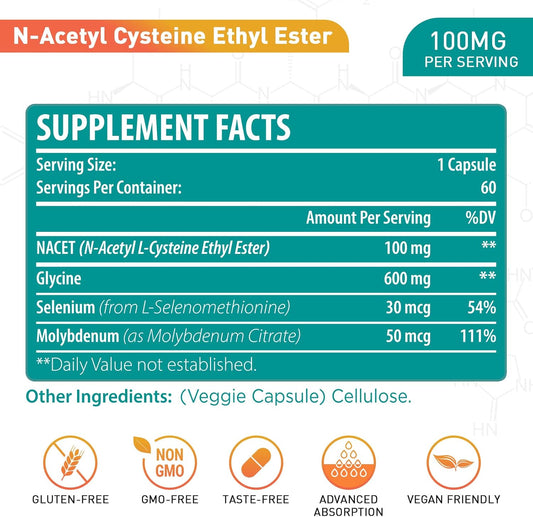 NACET Lipmaxmall N-Acetyl Cysteine Ethyl Ester Capsules with Glycine for Immune System Support - 60 Capsules - 100mg