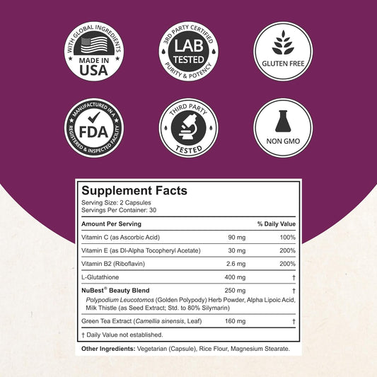 NuBest White Skin Brightening Supplement - Glutathione 400mg & Milk Thistle Extract - Antioxidant & Detox - 2 Pack