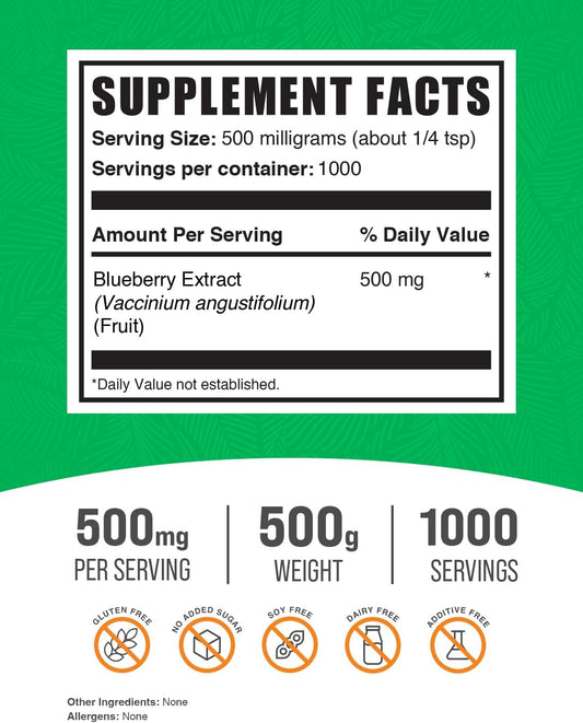 Blueberry Extract Powder - Vegan & Gluten-Free Supplement, Wild Blueberry Extract 500mg - 500g (1.1 lbs) Pack