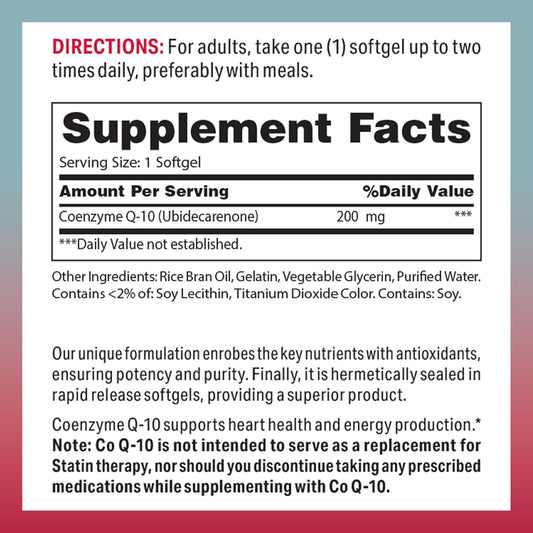 CoQ10 200 mg Softgels for Antioxidant & Heart Health Support - 120 Rapid Release Gluten Free Supplements