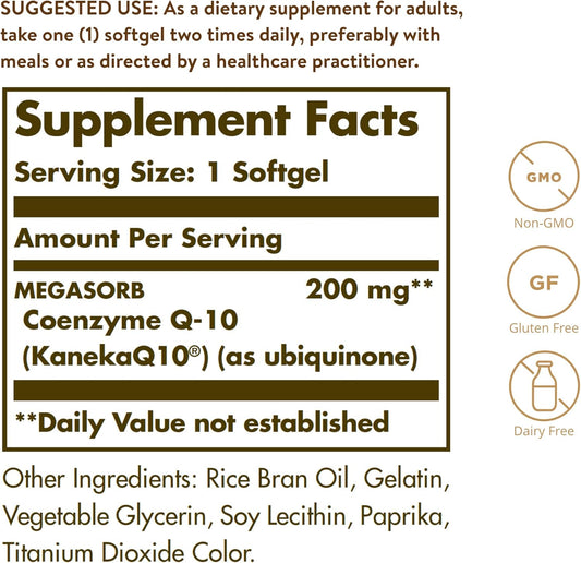 Solgar Megasorb Coenzyme Q10 200 mg Softgels - Heart & Brain Support - Enhanced Absorption - Gluten & Dairy Free - 30 Servings