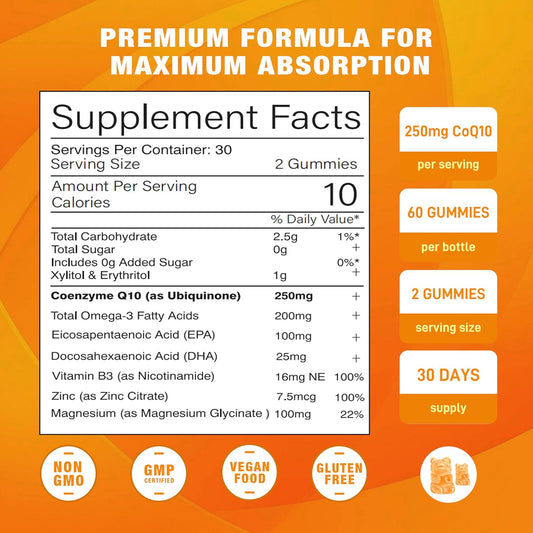 Sugar-Free CoQ10 Gummies with Omega-3, Vitamin B3, Zinc & Magnesium - 5X Absorption, Antioxidant & Energy Boost - Peach Flavor - 60 Count