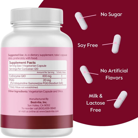 Vegan Coq10 100mg with PQQ 20mg - Non GMO - Gluten Free - 120 Veggie Capsules by BESTVITE