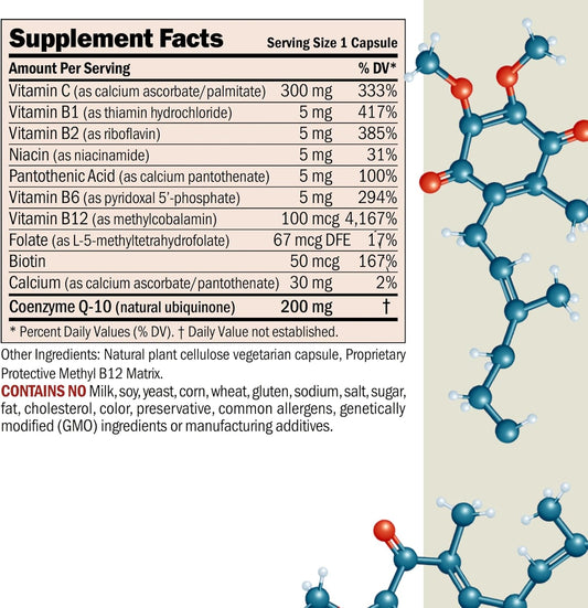 120 Easy-to-Swallow Coenzyme Q-10 200 mg Capsules with B-Complex for Energy and Organ Function, Antioxidant Support, Aging Depletion Replenishment