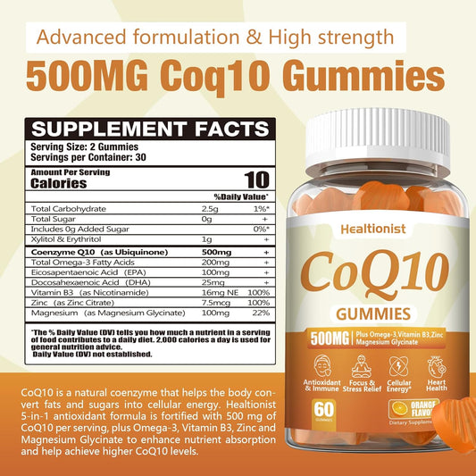 500MG CoQ10 Gummies with Omega-3, Magnesium, Vitamin B3 & Zinc - Heart Health Supplement for Energy & Antioxidant Support - Vegan, 60 Count Pack