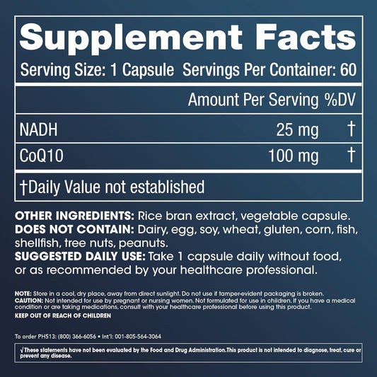 60-Day Supply ProHealth NADH + CoQ10 Capsules for Energy, Focus, and ATP Production - 25mg Pure NADH, 100mg CoQ10 - 60 Acid-Resistant Capsules