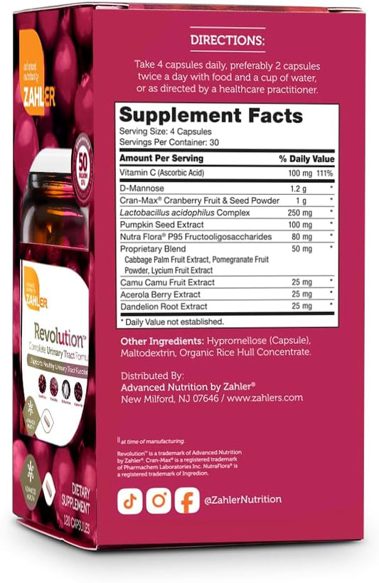 Zahler UT Revolution Cranberry Concentrate Pills with D-Mannose and Probiotics for Urinary Tract and Bladder Health, 120 Caps - Kosher