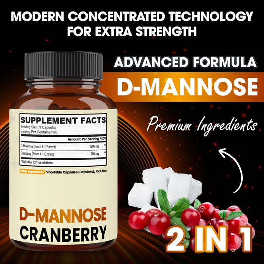 Super Concentrated D-Mannose and Cranberry Blend Capsules - 240 Vegan Pills for UTI, Digestive & Immune Support - 80 Day Supply - Gluten-Free, Non-GMO