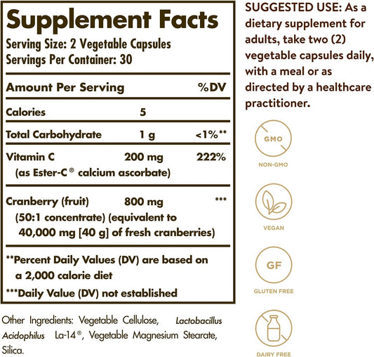 Solgar Cran Flora Capsules with Probiotics, Ester-C, and Cranberry Powder - Supports Urinary Tract, Immune, and Intestinal Health - Non-GMO, Vegan, Gluten-Free, Dairy-Free - 60 Veggie Capsules