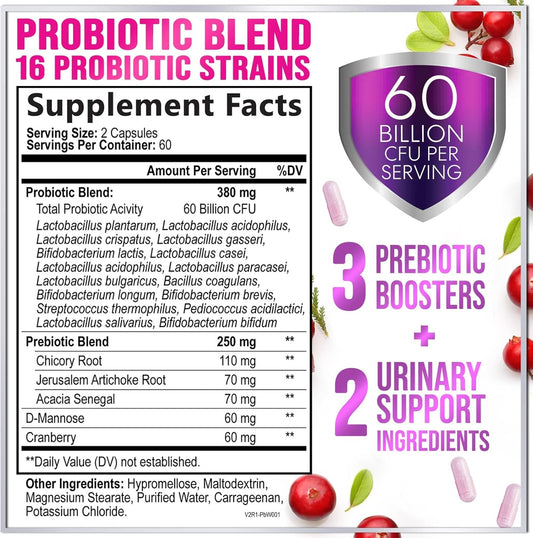 Women's Probiotic 60 Billion CFU, 16 Strains for pH Balance, Vaginal & Digestive Health, Prebiotic + Cranberry - 120 Capsules