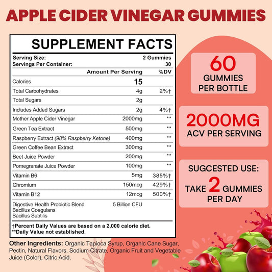 60 Count Vegan Apple Cider Vinegar Gummies for Gut Health - Non-GMO with Vitamin B12, B6, Beet Root & Pomegranate - Energy & Detox Support