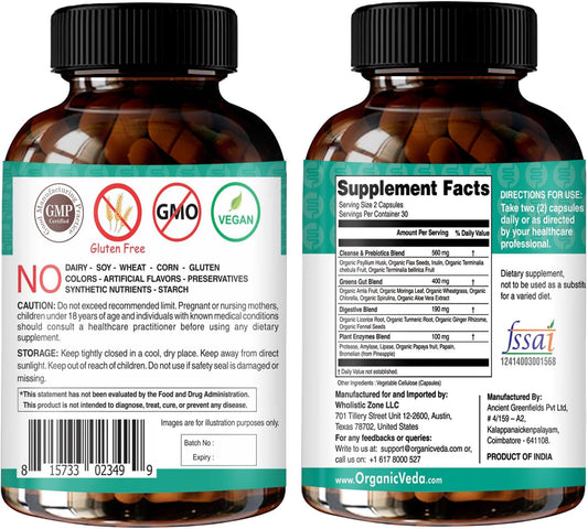 Organic Veda Super Greens Total Gut Health & Digestion Supplement - Colon Cleanse with Superfoods, Turmeric, Papaya, Chlorophyll, Moringa - 60 Capsules