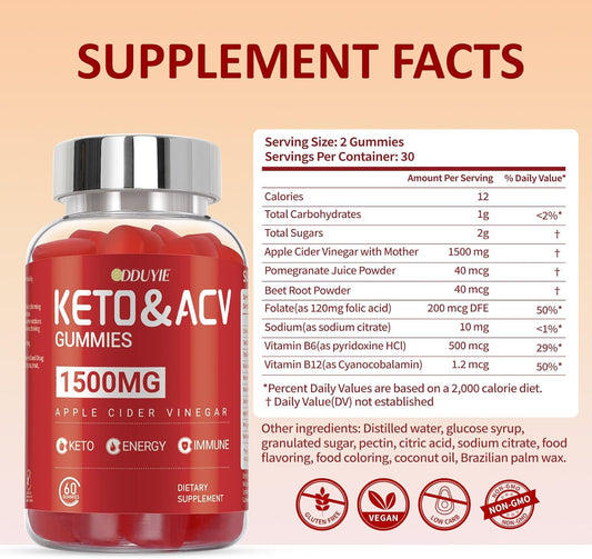 Premium Keto Apple Cider Vinegar Gummies - 1500MG with B12 & B6 Vitamins - Boost Energy & Wellness - On-The-Go Convenience - 60 Count