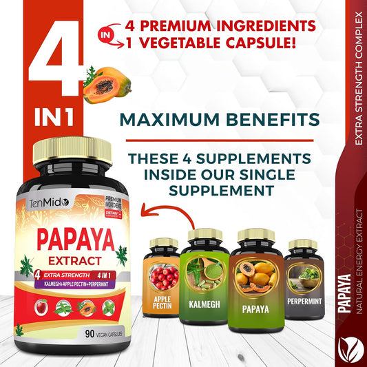 3 Month Supply Papaya Leaf Extract Capsules with Kalmegh, Apple Pectin, Peppermint - Enhanced Digestion - 90 Vegan Capsules
