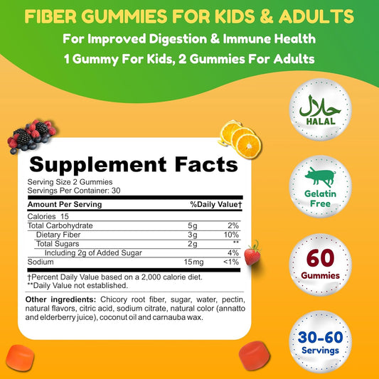 Halal & Gluten Free Fiber Gummies for Kids & Adults | 3g per Serving, 60 Gummies | Boosts Digestive Health & Immunity with Vegan Prebiotic | Non-GMO & Gelatin-Free