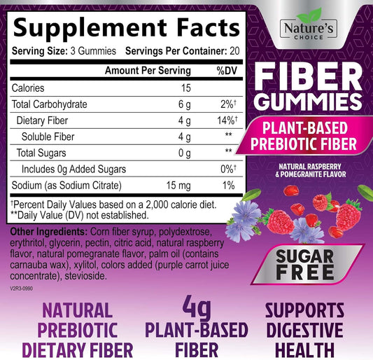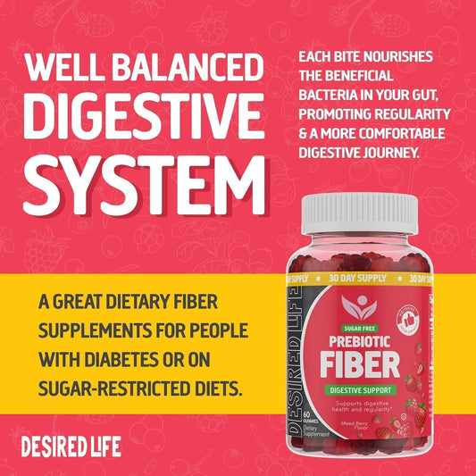 Sugar Free Prebiotic Fiber Gummies - Mixed Berry Flavored Plant Supplement for Adults & Kids - Promotes Digestive Health & Regularity - 60 Count Pack