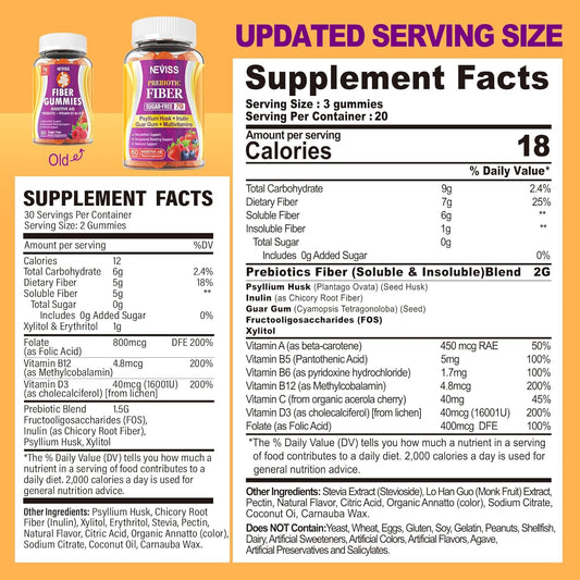 NEVISS Sugar Free Fiber Gummies with Prebiotic Blend, Multivitamins, Vitamin D3, B9, C - 7G Fiber, 2000mg Prebiotic Fiber, B12 10000 mcg