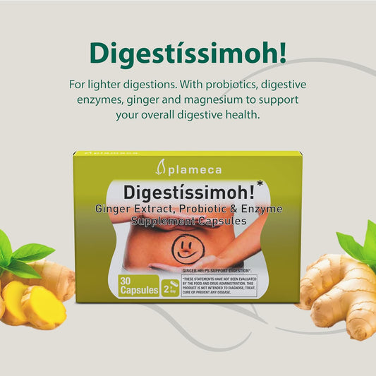 Plameca Digestíssimoh! Digestive Enzymes & Probiotics with Ginger Extract - 9 Strains for Gut Support & Meal Time Relief - Gluten-Free, Dairy-Free - 30 Capsules