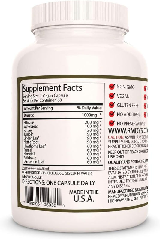 1000mg Diuretic Herbal Dietary Supplement Capsules | 60 Vegan Capsules | Non-GMO, Gluten Free, Dairy Free | Remedy's Nutrition