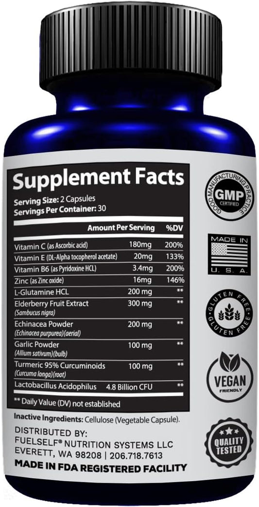 60 Count FuelSelf Immune Support Booster Supplement with Elderberry, Vitamin C, Echinacea, Turmeric, Zinc, L-Glutamine, Garlic, Probiotics