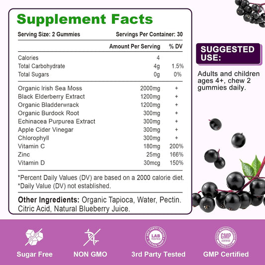 Vazatisi Blueberry Elderberry Sea Moss Gummies with Apple Cider Vinegar & Vitamins for Women, Men & Kids - 60 Ct