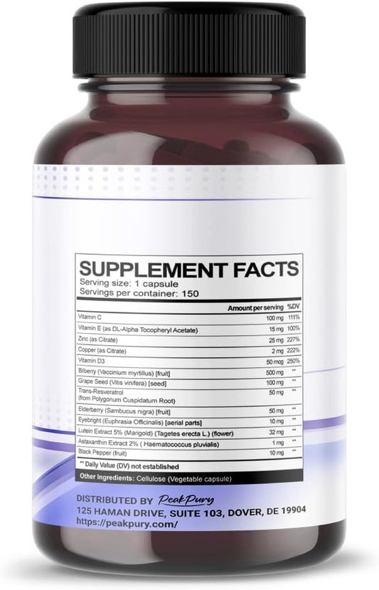 150 Capsules PeakPury All-in-One Eye Health Supplement with Bilberry, Eyebright, Astaxanthin, Elderberry, and Resveratrol - Antioxidant-Rich Formula Made in the USA