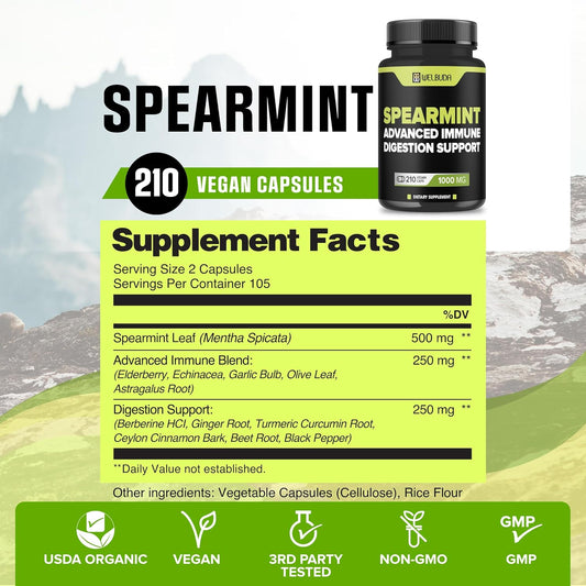 210 Capsules of WELBUDA Spearmint Supplement with Olive Leaf, Ginger Root, Black Pepper - Promotes Digestion, Respiratory Health, Immunity, Positive Mood