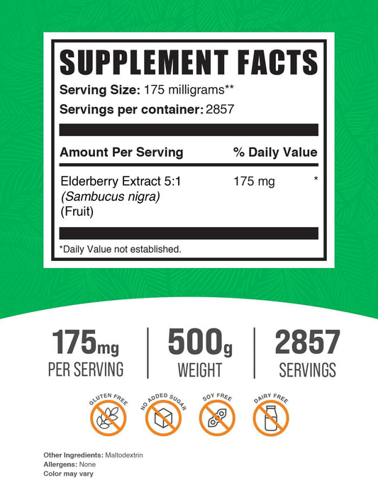 BulkSupplements.com Black Elderberry Extract Powder - Immune Support Supplement - Gluten Free - 175mg per Serving, 500g (1.1 lbs) Pack