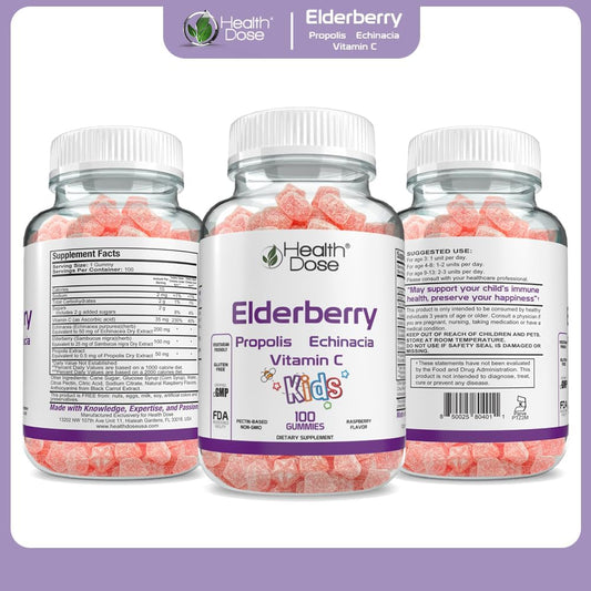 Elderberry Sambucus Gummy Vitamins for Kids with Propolis, Echinacea, Vitamin C - Raspberry Flavor, Vegan, Gluten-Free - Immune Support Booster, 100 Gummies