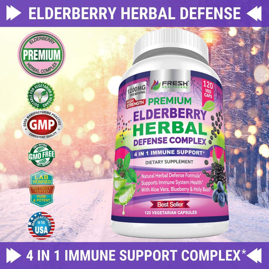 Premium Elderberry Capsules 1200mg Complex - Immune Support Supplement with Aloe Vera, Blueberry & Holy Basil - Non GMO, Gluten Free - 120 Vegan Capsules