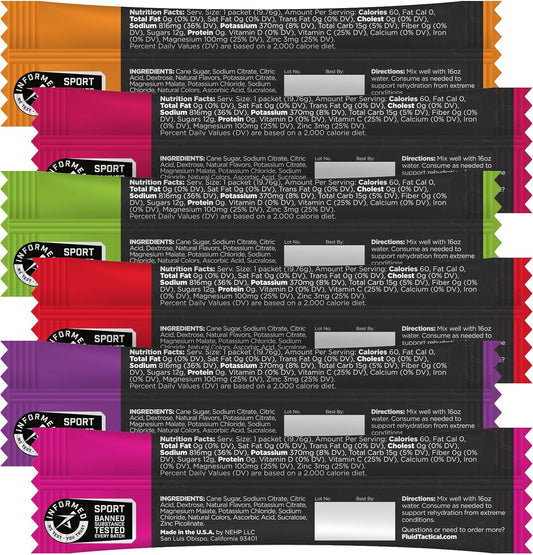 Variety Pack of Travel-Ready Electrolyte Powder Sticks for Extreme Re-Hydration and Cramp Prevention, Low Sugar Formula, Fluid Tactical