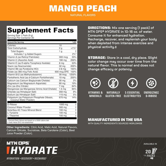 MTN OPS Hydrate Electrolyte Powder Drink Mix - 20 Single Serving Packs, Mango Peach Flavor, 1000mg of Electrolytes