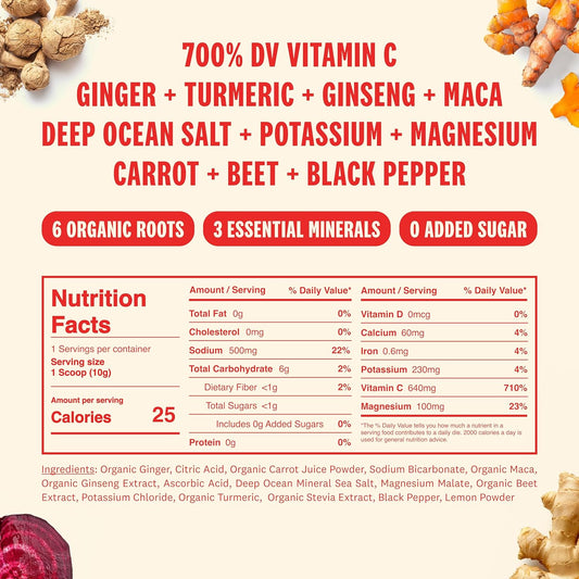 Superoot Ginger & Citrus Flavored Electrolytes with Deep Ocean Minerals, Antioxidants, and Vitamin C for Detox & Immunity Boost | Caffeine-Free Energy & Hydration Drink with 0 Added Sugar | 30 Servings