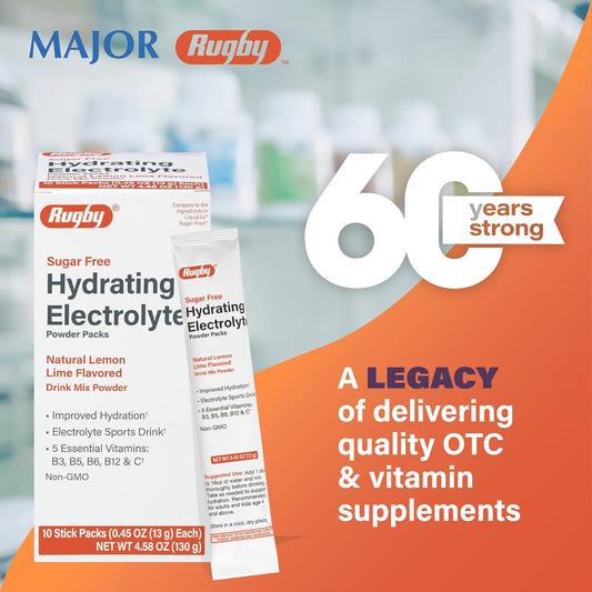 RUGBY LABORATORIES Hydrating Electrolyte Powder Packs with 5 Vitamins - Sugar-Free Drink Mix - Natural Lemon-Lime Flavor - Improved Hydration - 10 Stick Packs - 0.45 Oz - 1 Pack