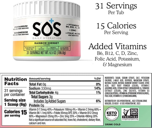 31-Serving SOS Hydration Electrolyte Powder in Rainbow Sherbert Flavor - Rapid Rehydration, Low-Calorie, Sugar-Free, Keto & Vegan-Friendly