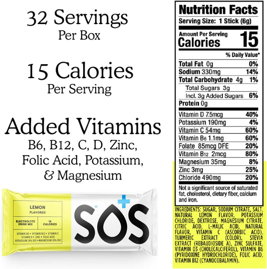 SOS Hydration Electrolyte Powder Packets - Lemon Flavor, 8 Sticks, Low-Calorie, Zero Sugar, Rapid Rehydration, Made in USA, Keto & Vegan Friendly