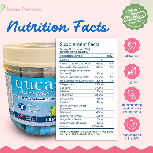 Three Lollies Queasy Hydration MD Packets - Natural Digestive & Hydration Support - Rehydrate, Ease Nausea, Replace Nutrients - Non-Drowsy - 50 Packets